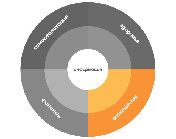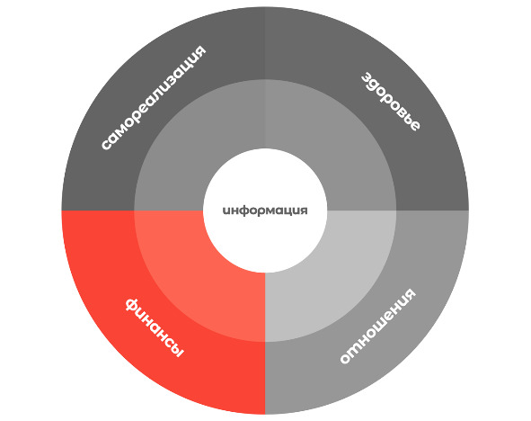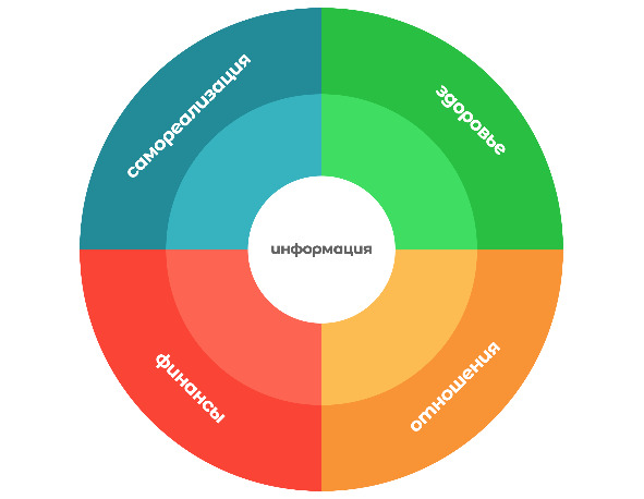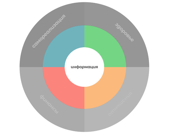 В её ядре находится информация о том, как создавать информационную систему и как с ней работать (центральный круг). Затем у нас есть 4 подсистемы (здоровье, финансы, отношения, самореализация), которые базируются на центральном ядре (второй круг). А затем эти 5 подсистем информации влияют на создание в своей жизни всех 5-и систем в реальной жизни (третий, внешний круг).