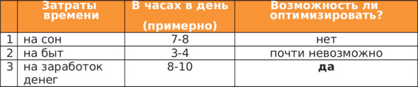 Хорошо. Теперь мы ясно увидели для себя как происходит растрата нашего времени жизни. А можем ли мы как-то эти траты жизни оптимизировать? Можем ли мы найти какой-то способ, чтобы высвободить часть времени своей жизни, а также найти способ, чтобы в единицу времени получать больше денег?