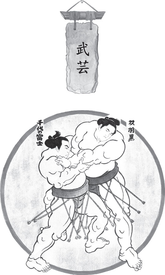 Спортивные состязания борцов, активно практиковавшиеся в те далекие годы, назывались «тикара-курабэ» – «соизмерение сил», поскольку исход поединков определялся не столько техникой, сколько силой, натиском и боевым задором. Именно эти качества были основными в сумо – древнейшем виде рукопашного боя. Этому воинскому искусству посвящена одна из следующих глав нашей книги. Пока же нас сумо интересует как один из истоков дзю-дзюцу. Техника сумо в те годы (а историки первые достоверные сведения о сумо относят к 642 году, когда по указанию императора при дворе состоялись состязания в честь корейского посла, более ранние сведения следует отнести к легендам, мифам) была достаточно проста и включала в себя толчки, сбивы и заваливания. В почете были сила и вес борца. Победа присуждалась участнику, бросившему соперника наземь. Удары и борьба в партере не практиковались.