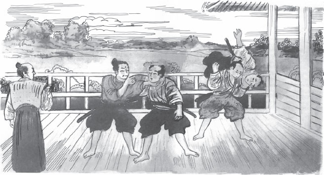 «В финале турнира Морихэю противостоял могучий капрал Ёмода. Когда они оба вышли на помост, то по толпе зрителей пронесся веселый ропот. Уж очень несуразно выглядели оба финалиста. Ёмода был на полторы головы выше Морихэя, да и весил раза в полтора больше. На губах его играла снисходительная улыбка. Всех своих предыдущих соперников он подавлял мощью своего могучего тела, и теперь, глядя на маленького Морихэя, он не мог сдержать усмешки…