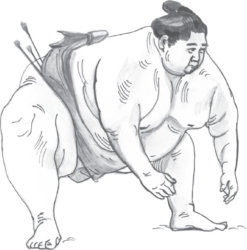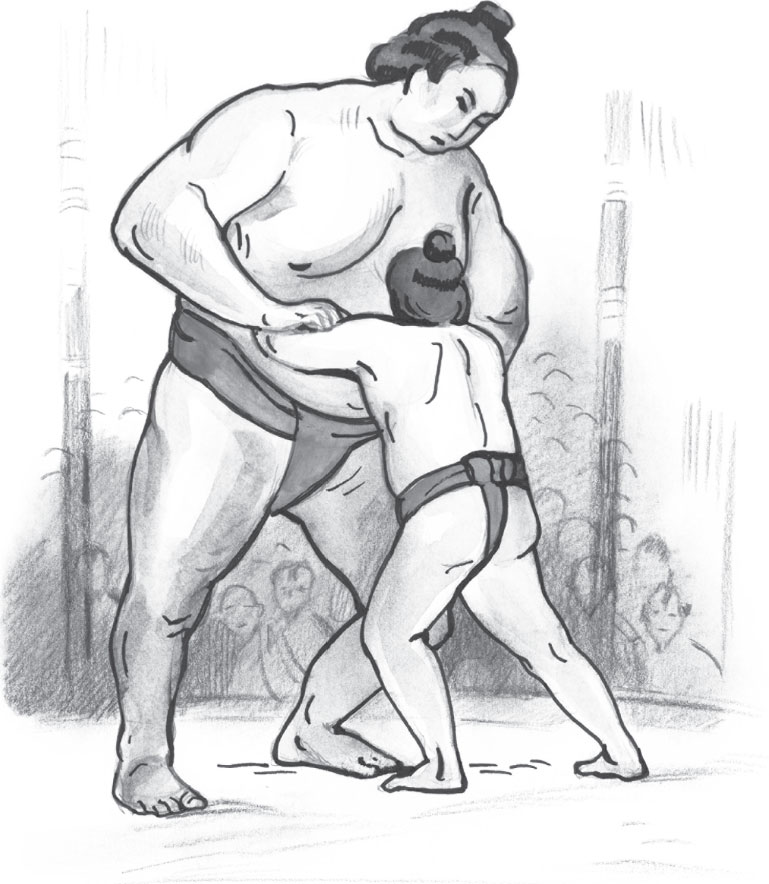 В поединке борцов сумо, согласно правилам, побеждал тот, кто заставлял соперника коснуться пола любой частью тела – коленом, рукой, головой – или вынуждал его выйти за пределы круга. Весовые категории отсутствовали, поэтому явное преимущество получали более тяжелые борцы, подавлявшие своих соперников напором и массой. Но вот что удивительно: испокон веков в сумо выделяли три составляющие победы – бойцовский дух, технику и массу, и здесь, как видите, масса стоит на последнем, третьем месте. И это в истории сумо получило подтверждение во многих поединках. Вот два отрывка из художественных произведений, подтверждающих этот, казалось бы, парадокс.