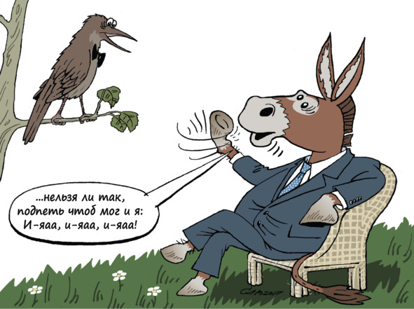 Осёл, услышав гостя – Соловья, сказал, что длинными руладами тут голосить нельзя. Что нужно соблюдать традиции: не петь с душой и сердцем даже и на репетиции.