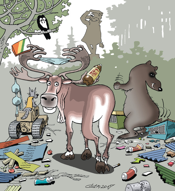 Олень рогами окна разбивает, Медведь ковшом усердно крыши протыкает.