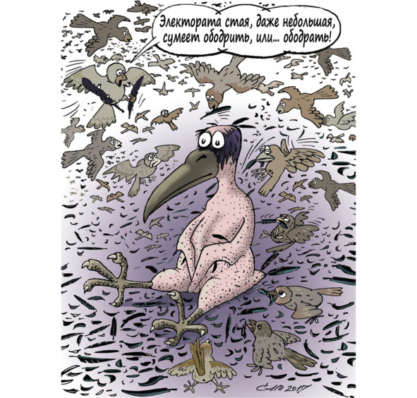 Однако в жизни всё бывает… Однажды после выборов лесной сенат и Ястреба, и Канарейку жуликами объявляет. Таков итог. На обсуждении подложных результатов на форуме пернатом не обошлось без матов. «Ворона каркнула во всё воронье горло», мол, власть коварная все голоса вороньи спёрла.