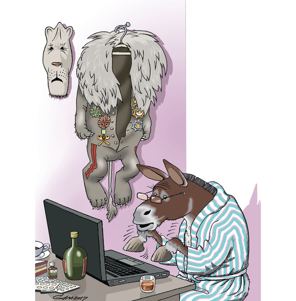 Надев однажды маску сильного с душой великой, благородной Льва, вершил Осёл в родных пенатах важные дела. А дабы не попасть впросак или не брякнуть что-то невпопад, правитель Лев-Осёл зверушек взял из тех, что поумней, да учредил сенат.