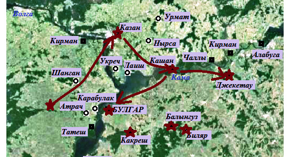 – 4-е нашествие. 200-тысячная армия хана Бату начала громить города и селения Волжской Булгарии. 12 месяцев оказывали героическое сопротивление города Болгар, Биляр, Сувар, Жукотин (Джукетау), Керменчук, Синбир, Золотаревское городище и др. Последний булгарский эмир Абдуллах погиб при обороне столицы г. Биляр. Сыновьям Абдуллаха пришлось присягнуть на верность Хану Батыю и так они остались живы. Алтын-бек скрылся за реку Каму и сел в белокаменной крепости Керман – Меркерман (будущая Казань), а Алим-бек с телом отца уехал в родовое поместье на реке Черемшан, где похоронил его. И начал строить новый город Балымат. (Восстание Волжской Булгарии против монголов хана Батыя | Лукинский I История | Дзен художественное описание)