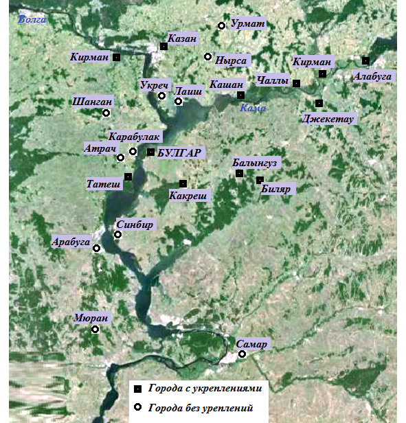 – Государство защищало от внешних неприятностей все этносы, живущие на всей территории Волжской Булгарии. Для этой цели они начали строить земляно-деревянные крепости. Так появляются первые города. На правом берегу Волги известны такие города, как Ошель (Шел), Симбир, Кан, Таябинское городище (Батыревский район), Тигашевское городище (Батыревский район) и др. На окраинах земель восточной мордвы, марийцев, удмуртов, коми-пермяков и коми-зырян были устроены сторожевые пункты (небольшие крепости).