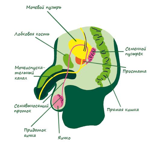 Когда приходит время использовать сперматозоиды, большая их порция выталкивается из обоих придатков яичек. Каждый соединён с тонкой трубкой – семявыносящим протоком. Они идут из мошонки прямо вверх, а затем изгибаются назад так, что с каждой стороны от мочевого пузыря получается «мёртвая петля», как на американских горках. Семявыносящие протоки около 30 сантиметров в длину и впадают в мочеиспускательный канал прямо под мочевым пузырём.