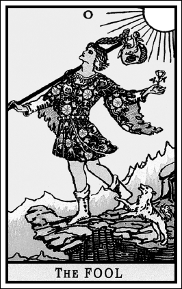 Молодой человек стоит на краю скалы очень высоко в горах. В руках у него жезл (он – Путник) с привязанной котомкой (в ней опыт души, в других трактовках – Младшие арканы) и белая роза (символ невинности). Он одет в разноцветное (изобилие опыта) платье с летящими рукавами. 10 желтых дисков, разделенных линиями на 8 частей, символизируют 10 сефирот Древа Жизни, которые пока еще не выстроились в четкую структуру. Его распахнутая поза, развевающиеся рукава на ярко-желтом фоне, перо на головном уборе – все вместе создает впечатление, что юноша готов взлететь над бездной (соответствие Воздуху). Белое лучистое Солнце (свет первой сефиры Кетер) – близость Шута к первоисточнику. В позе собаки (вера, друг, инстинкт) просматриваются очертания первых двух букв иврита «алеф» и «бэт». Движение Шута справа налево – так пишутся и читаются тексты на иврите. Ключевые смыслы: Дух в поисках опыта, творчество, свобода, поиск, начало, невинность, ребенок. Тайное значение: «Все мы всегда свободны»[13]13
