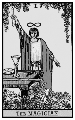 Правая рука с жезлом стоящего у стола мужчины поднята вверх, левая опущена вниз. «Этот жест указывает на стяжание благодати, добродетели и света, взятого от высшего и прилагаемого к низшему», – пишет Уэйт. Символ связи небесного и земного, Маг – проводник высшей Воли в земную реальность. Мужчина одет в белый хитон (чистота намерений), его опоясывает пояс в форме уробороса, змеи, кусающей свой хвост (символ Вечности и бесконечности совершенствования Духа), сверху красная накидка (активность Мага). Знак бесконечности над головой (лемниската, математический символ) здесь употреблен как символ Святого Духа, знак жизни в виде бесконечной ленты.