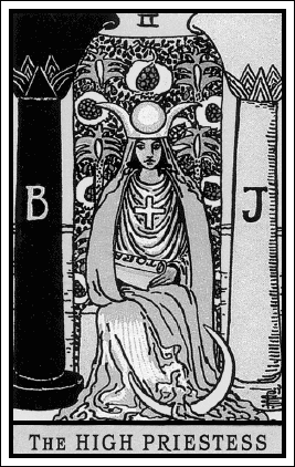 Уэйт считает аркан Жрица среди других Старших арканов наиболее высоким и священным, женской стороной божественности. Одно из ее имен – Шехина, на иврите это слово означает «присутствие». Присутствие Бога в Высшем и в физическом мире, дуальность мира и дуальность сознания. Жрица сидит меж двух колонн: белой с буквой «J» (Йахин), символизирующей позитивную, мужскую жизненную энергию, и черной с буквой «B» (Боаз), представляющей негативную, женскую. Меж двух колонн натянута завеса, на ней пальмовые листья (мужской символ победы и мира) и плоды граната (сложный символ, среди многих смыслов – праведность и познание, как Древо Познания в Раю). Гранаты расположены в виде схемы Древа Сефирот. За завесой – море (непознанное). В руках Жрицы – прикрытый (тайная часть) священный свиток, TORA (Закон). TORA-TARO. У ног – серп Луны (женское начало, бессознательное). Луна трижды повторена в головном уборе: молодой серп, полная, убывающая – девушка, мать, старуха. Ключевые смыслы: женственность, невинность, тайна, интуиция, познание. Тайное значение: «Все, что внутри нас, – отражение того, что над нами».