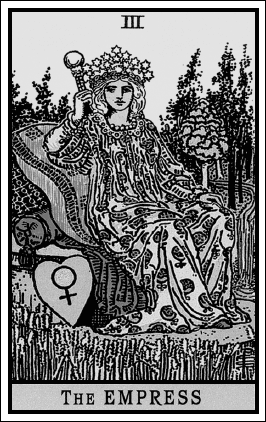 Величественная женщина в роскошном платье для беременных сидит на мягких подушках невысокого трона. На голове у царственной особы диадема из двенадцати звезд (знаки зодиака, небеса), в руках скипетр, «увенчанный, – по словам Уэйта, – земным шаром, символизирующим этот мир. На щите, отдыхающим у ее ног, символ Венеры». Символ Венеры обозначает единство духа и материи. Она хранительница закона (планета Венера – управитель Весов) и властительница земли (Венера как управитель Тельца). Она – сама любовь (богиня Афродита, щит в форме сердца) и плодородие (богиня Деметра). В средневековой живописи женщин изображали беременными, подчеркивая именно этот аспект. Колосья пшеницы на переднем плане символизируют идею прорастания и развития потенциала. Ручей, текущий сквозь лес, подобен нашей жизни, течет от истока к растворению в море. Так и мы – идем от истока в небытие. Тройка – это разрешение дуальности двойки. Ключевые смыслы: рост, новый уровень и база для следующего шага. Хозяйка. Мать. Тайное значение: «Вся природа божественна, и все живое живет».