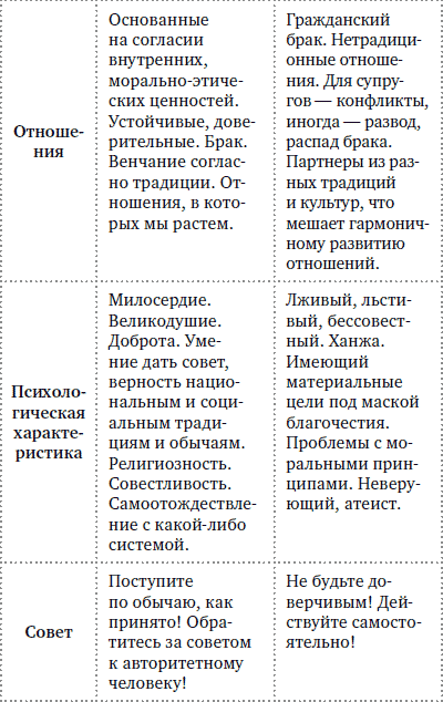 [Закрыть] греческое и в переводе означает «тот, кто разъясняет священные понятия», это верховный жрец, первосвященник, посвящающий в таинства мистерий. На карте три фигуры: сам Иерофант и два склоненных священника, их он благословляет правой рукой. Два ключа у ног Иерофанта – символ из церковной геральдики, обозначающий светскую и духовную власть (земной и небесный рай). Он сидит на троне в одеждах, похожих на папское облачение: белая ряса и красная накидка на ней, с тремя крестами по белой центральной линии. Папская регалия, тиара, тройная корона, символизирует три функции Папы Римского: «первосвященника», «верховного пастыря», «верховного учителя». (Пастырь заботится о душах паствы, Учитель – толкователь истины.) Этот человек объединяет в себе все три функции. Он учит не только словами, а собой, своей жизнью, построенной на принципах традиции, совести, морали, чести. Ключевой смысл: чувство веры как внутренняя опора, понимание сути и духовного смысла происходящего. Тайное значение: «Всё учит тебя истине, необходимо лишь увидеть».