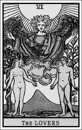 В этой карте А. Э. Уэйт хотя окончательно не отошел от традиционного понимания Шестого аркана как карты выбора, но все же выделил любовь как главную тему. Сцена развернулась в Раю. Светит солнце. Ева и Адам обнажены, открыты друг другу и Ангелу, восставшему из облака. Ангел защищает пару огненными крылами. Уэйт пишет: «Это карта незапятнанной человеческой любви, являющейся частью пути, истины и жизни. Фигуры означают юность, девственность, невинность и любовь до того, как это было запачкано физическими, плотскими желаниями». За спиной Адама – Древо Жизни с двенадцатью плодами. Их разрешено вкушать. За спиной Евы – Древо Познания Добра и Зла. Ствол его обвит Змеем, который уже что-то нашептывает Женщине на ушко. Вот-вот случится непоправимое. Искушение велико. Чувственность подчеркивается фиолетово-красным фаллическим холмом на заднем плане. Ключевой смысл: партнерство, любовные отношения, открытость, чувственность, правильный выбор. Тайное значение: «Все закончится там же, где начиналось, – в Саду».