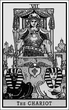 На карте три фигуры: человек и два сфинкса. В колеснице стоит Герой, голова увенчана лавровым венком победителя и короной со звездой. Важные элементы глифа – лунные серпы на плечах, внутри которых будто маски, это урим и туммим – загадочные атрибуты древнееврейского священника, дававшие ему некую возможность или способность вопрошать и разуметь волю Божию. Уэйт считает, что Колесничий символизирует завоевания на всех уровнях – в разуме, в науке, в испытаниях на пути посвящения. И называет его тем, кто сумел разгадать загадку Сфинкса, который от огорчения прыгнул со скалы и разбился. Как это понять? Сфинкс – это мифическое чудовище с телом быка (Земля), лапами льва (Огонь), женской головой (Воздух) и крыльями (Вода, Скорпион). Четыре стихии, проявленные в мире материальном. Герой отгадал загадку Сфинкса – разум победил материю. Герой управляет белым и черным сфинксами без вожжей. Ключевая мысль: он своим разумом и волей контролирует внешние проявления внутренних противоборствующих сил. Тайное значение: «Поверхность пуста, а пустота полна».