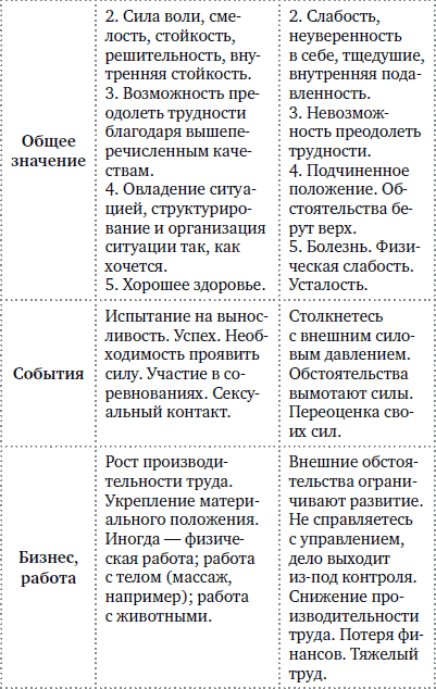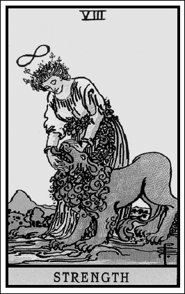 В традиционных колодах аркан Сила стоит под номером XI, а номер VIII принадлежит аркану Справедливость. А. Э. Уэйт поменял их местами, видимо следуя идеям М. Мазерса об астрологических соответствиях козырей, определяющих последовательность карт. В клонах колод Уэйта-Смит сохраняется эта перестановка. Она не влияет на интерпретацию раскладов, если таролог не использует нумерологические и каббалистические подходы в толковании. Дева в белом одеянии закрывает открытую пасть льва. Символизм льва имеет двойственное значение: мужское, солярное начало – принцип огня, великодушие, сила, но и свирепость, агрессивность; и женское, материнское, но и поглощающее, пожирающее. Лев в его диком состоянии является символом скрытых страстей. Красный лев в алхимии – символ золота. Над головой Девы парит лемниската, она же присутствует на карте Маг и объединяет эти две карты не только идеей бессмертия души, но и понятием воли. Маг – воля, намерение, здесь – в оля и сила. Ключевая идея: сила воли и сила духа умиряют льва. Тайное значение: «Мы всегда суть то, с чем мы сражаемся».