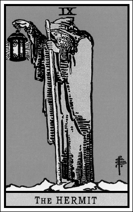 Высоко в горах по снежному плато медленно ступает пожилой человек в плаще, благоразумно опираясь на посох и освещая дорогу фонарем. Иконография этой карты отличается от традиционной тем, что фонарь не спрятан под плащом Отшельника, а своим светом освещает все вокруг. Свет фонаря похож на шестиконечную звезду: это гексаграмма. Она образуется из двух треугольников и означает гармонию материального и духовного начал: человеческого – треугольник концом вниз, и божественного – треугольник концом вверх. А. Э. Уэйт пишет: «…это карта свершения, и в расширенной концепции вся фигура подобна маяку в неизведанном пространстве… Его маяк вещает: „Там, где я, вы также можете быть”». Это частый образ архетипа старика-мудреца. Это такой период развития человека, когда он обретает внутренний мир и благоразумие. А. Э. Уэйт пишет: «…благоразумие состоит в том, чтобы согласовывать возможность с желаниями». Ключевая идея: благоразумие тщательно обдумывает последствия прежде действий. Тайное значение: «Ты уже там, куда ты идешь».