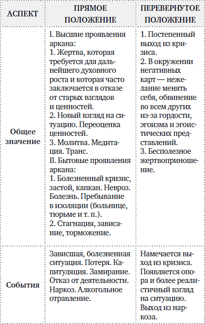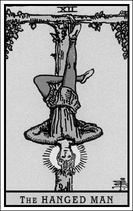 Странная картина. На рисунке герой висит головой вниз, его правая нога веревкой привязана к тау-кресту, другая согнута в колене. Висящий человек совсем не удручен, лицо его не выражает страдания, напротив, у него удовлетворенное выражение лица, вокруг головы – светящийся нимб. Все говорит о том, что он осознанно позволил себя повесить. Зачем? Тау-крест – это часть анха, символа жизни. Он символизировал жизнь и плодородие. Его рисовали ветхозаветные евреи на дверях в первую ночь Пасхи, ища божественной защиты, когда готовились к исходу из Египта. То есть – с имвол защиты, но и распятия (некоторые считают, что крест, на котором был распят Христос, тоже был тау). А. Э. Уэйт пишет, что «фигура, в целом, символизирует замершую жизнь, но жизнь, а не смерть… карта выражает связь Божественного начала и Вселенной в одном из ее аспектов». Ключевая мысль: повешение означает отречение от меньшего ради большего. Один, провисев на Древе Иггдрасиль, потеряв глаз, обрел тайные знания и прошел посвящение в руническое искусство. Тайное значение: «Свет пронизывает все».