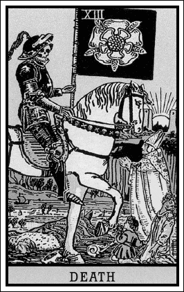 По полю медленно едет на белом коне огромная фигура: скелет в рыцарских доспехах. Это Смерть. В руках у нее черный флаг с белой мистической розой, символом жизни и чистоты помыслов. Люди по-разному встречают всадника. Священник в золотых ризах ожидает стоя, он молится, он готов, он верит в жизнь вечную в царстве небесном. Ребенок, стоя на коленях, смотрит на всадника, почти не выражая страха. Мал и не понял, что надо бояться. Дева, пришедшая сюда из аркана Сила, отклонилась, но ей достает внутренних сил, чтобы смириться с неизбежным. И лишь король пал навзничь, уронив под копыто корону. Вдали, за рекой, меж двух башен видно яркое солнце, символ бессмертия. А. Э. Уэйт описывает ключевую идею аркана: «Естественный переход человека на следующий уровень с того, на котором он был или находится, может быть формой его прогресса, но ирреального и неизведанного перехода; все еще пребывая в этой жизни, войти одновременно в страну мистической смерти – это трансформация формы сознания и вход в область, путь к которой не проходит через врата обычной смерти». Тайное значение: «В этом мире нет ничего, кроме изменений сознания».