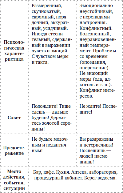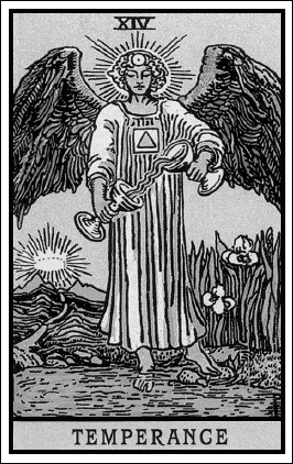 Умеренность – четвертая добродетель, представленная в системе Таро. Она выражается в умении находить середину между крайностями, соблюдать во всем точную меру, совмещать несовместимое, согласовывать желания души с возможностями тела. «Называя эту карту Умеренностью, подразумевают, что если это качество овладевает нашим сознанием, то оно умеряет, сочетает и согласовывает духовную и материальную природу», – пишет А. Э. Уэйт. На карте Ангел, один из трех, представленных в Таро. Во лбу его – знак Солнца, на груди – треугольник сил небесных, заключенных в квадрат материи (четыре стихии), напоминая нам о том, что тело – храм души, над квадратом читаются буквы иврита JHVH (имя Бога). Ангел переливает из чаши в чашу субстанцию жизни. Симметрично расположены на рисунке его ноги. Одной ногой Ангел стоит на земле, другой в воде, символизируя истоки жизни. Ключевая идея: гармонизируя психическую энергию (вода) и материальную природу (земля), мы достигаем самореализации. Тропа, восходящая в горы, к солнцу, – путь к раскрытию талантов. Тайное значение: «Мы лишь примиряем».