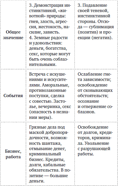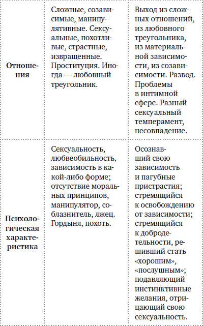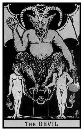 [Закрыть] (сатана и др.) – это религиозно-мифологическая персонификация зла. Ныне он понимается как враг Бога и человека, который искушает, провоцируя проявления людской порочности, стремясь отдалить человека от Бога. Слово «дьявол» происходит от греческого и имеет изначальный смысл «клеветник», «подстрекатель». На глифе изображены трое. У нас уже были такие композиции. Помните арканы V и VI? Там были Вера, Благословление и Любовь. Тут зло, Тень, то, что мы сами от себя прячем. Инфернальная фигура с перевернутой пентаграммой во лбу, символ зла, нагло благословляет пару правой рукой, а левой огнем факела исподтишка разжигает животные страсти. Пара, оба с рожками и хвостиками (животное начало), стоит с цепями на шеях. Цепи лежат свободно, и можно освободиться. Ключевая идея: Дьявол – аспекты нашей животной природы, не стоит их бояться, с ними нужно встретиться и подчинить себе. Тайное значение: «Не бывает ничего лишнего».