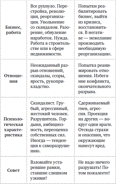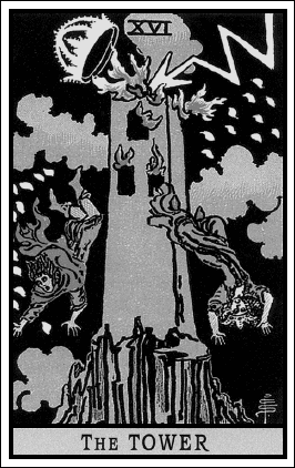 Эта карта несложна в толкованиях, поскольку ее метафорический смысл легко читается. Внезапное разрушение чего-то, мгновенный крах. Крах чего? Предлагаем рассмотреть карты Дьявол и Башня, положив их рядом. Их объединяют черный фон и две человеческие фигуры. Эти двое, искушенные Дьяволом, выстроили высоченную башню, надели корону, и вот молния – гнев Божий покарал самозванцев.