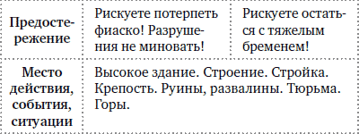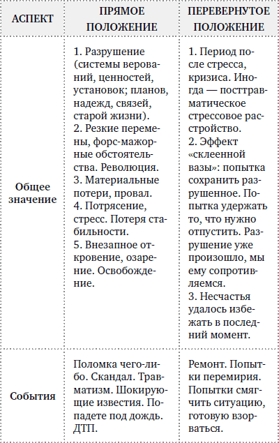 Что же символизирует Башня? Это не только здание. Это, скорее, башня косности, увязания в какой-то доктрине, в учении, в понятиях и мировоззрении, ограничивающих широту взглядов. Это ситуация, когда человек, искушаемый своими желаниями, теряет или продает душу, дабы «достичь», «получить», «занять место» и т. д. Он теряет связь со своим духовным центром, принимая ограничивающие его сознание формы, то есть отгораживается от разнообразия мира, помещая себя в узость башни и надев корону собственной правоты. Ключевая идея: мощный внешний толчок способствует уничтожению ограничений и открывает путь к правде и истине. Тайное значение: «Всякая вера в нашей голове, а не в реальности».