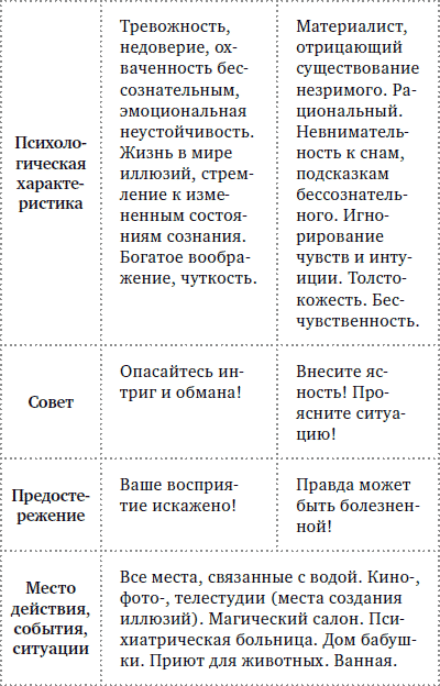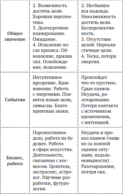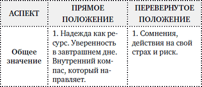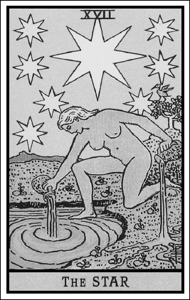 Центр карты – большая восьмиконечная звезда. А. Э. Уэйт называет ее Сириусом. Звезда из созвездия Псов – значимый элемент символизма. Она считается провозвестницей, ее видела во сне мать Гаутамы Будды, ее видели волхвы, пришедшие в Вифлеем, по ее восхождению на небе египетские жрецы предсказывали будущий урожай. Вокруг нее еще семь звезд. Под звездами – фигура обнаженной девушки. «Она левым коленом опирается на сушу и правой ногой на воду, – пишет А. Э. Уэйт. – Из двух больших кувшинов она изливает Воду Жизни, орошая море и землю». Небесный источник неиссякаем. Человек может черпать из этого источника бесконечно. Вера (нога на воде) дает опору и поддерживает душу, практическая реализация (опора на землю и пять ручейков из кувшина) – проявляет суть человека через его творчество. Вся композиция вместе передает идею круговорота энергии в природе. Ключевая мысль: это творческая, интуитивная, небесная часть человека, которая может раскрыться и проявиться легкой и прекрасной, подобно птице на дереве. Тайное значение: «Только истина может течь вечно».