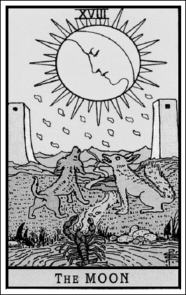 «Карта символизирует жизнь воображения, отделенную от жизни духа», – пишет А. Э. Уэйт. Собаку, волка и рака он называет образами нашей животной природы. Собака – укрощенная часть, волк – дикая. Рак, примитивная часть, стремится к свету сознания, выползает, но потом погружается в воды снова. Этот образ – аллюзия на комплексы бессознательного. Башни символизируют страхи и нелепые фантазии. Капли похожи на букву «йод», «роса мысли». Луна изображена весьма загадочно. Месяц – молодая часть, далее четкий профиль, символизирующий «лицо разума», и полный диск с лучами, коих в сумме тридцать два, как и путей на Древе Сефирот. Таким рисунком авторы, возможно, хотели передать идею трех состояний луны, соответствующих трем архетипическим женским образам: растущая луна – рост сил, девушка; полная луна – полнота сил, мать; убывающая луна – упадок сил, старуха. Ключевая идея: луна символизирует отраженный свет восприятия и олицетворяет бессознательные страхи, сновидения, заблуждения ума, воображение. Тайное значение: «Всякое отражение – это отражение истины».