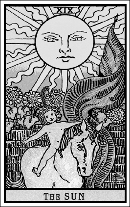 При взгляде на карту глаза первым делом останавливаются на Солнце. Оно занимает верхнюю половину карты. Солнце одушевлено, у него спокойное ясное лицо, символ божественного и мирского света, жизни, истины. Это целостность обновленного сознания, объединившая в себе женское, бессознательное (волнистые лучи) с сознательным, мужским (прямые лучи). Далее взгляд переходит на очаровательное голенькое Дитя верхом на белой лошади и с большим красным флагом в руках. Вспоминается карта Смерть, аркан XIII, на ней изображена Смерть на белом коне, – помните, на ней, в глубине, между двух колонн поднималось Солнце, что означало возможность трансформации? Прошедший трансформацию человек, обновленный и очистившийся, полный открывшихся возможностей, искренний и невинный, подобен ребенку. В аркане Солнце родилась новая духовная сущность. Подсолнухи, солнечные цветы, – поиск, обращение к свету. Ключевая мысль: Солнце представляет доступное любому человеку внутреннее духовное возрождение, раскрытие талантов и реализацию возможностей. Тайное послание: «Мы здесь для того, чтобы вернуть миру свет Сада».