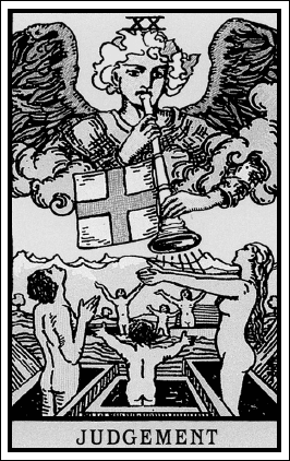 Это один из самых сложных арканов, его порой нелегко толковать в раскладах. Это карта о религиозном эсхатологическом понятии «Страшный суд», суть которого в том, что люди нарушают свои обязательства перед Богом и за это последует расплата в виде конца света, мирового хаоса, гибели Вселенной. Грешники и праведники на Страшном суде будут разделены: грешников накажут в потустороннем мире, а праведники будут спасены, воскреснут и обретут после Судного дня вечную жизнь. На карте мы видим сюжет: Ангел с небес вострубил, мертвые восстали из гробов, услышав глас. Две семьи, шесть человек – гексаграмма. Они услышали призыв, что-то в их душах откликнулось, они оставляют старое (гробы) и, безусловно, готовы к переходу к новому. Ключевая идея: кардинальное решение, скачок сознания, полное радикальное изменение жизни. Тайное значение: «Конец взывает к началу, а мы находимся между ними».