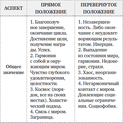 «Эта карта символизирует совершенство и конечность Вселенной…», – так начинает описание карты Мир А. Э. Уэйт. Обнаженная женщина, увитая длинной лентой и танцующая внутри эллипса, символизирует Мировую душу, anima mundi. Это философское понятие, обозначающее единую внутреннюю природу мира. Некоторые исследователи считают, что в центре танцует андрогин, то есть фигура, объединившая противоположности, мужское и женское начала. А если карту перевернуть, мы увидим Повешенного! Есть и такое понимание – он прошел свой путь, трансформировался и пришел к Миру. Ассоциации к венку: у эллипса два центра, эллиптическая орбита Солнца, две восьмерки бесконечности. По углам карты – четыре керубических животных, с которыми мы уже встречались в Аркане Колесо Фортуны; это символы стихий, то есть первоматерии мира сотворенного. Ключевая мысль: круг замкнулся, оборот завершен гармонично и продуктивно, грядущий цикл сменит закончившийся, не зря ведь овал похож на ноль. Шут уже на пороге. Тайное значение: «Мир – это все, что было, есть и будет и что никогда не будет полностью раскрыто».