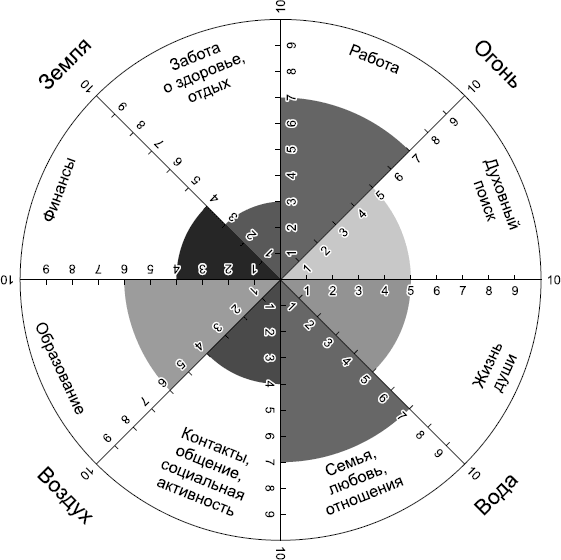 Потом обводим и закрашиваем оцененную часть секторов от центра до линии оценки. Например, сектор 1 (работа) закрашен до 7-го деления, то есть человек много работает, а сектор 8 (забота о здоровье) закрашен до 3-го деления, то есть недостаточно внимания уделяется здоровью.