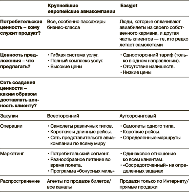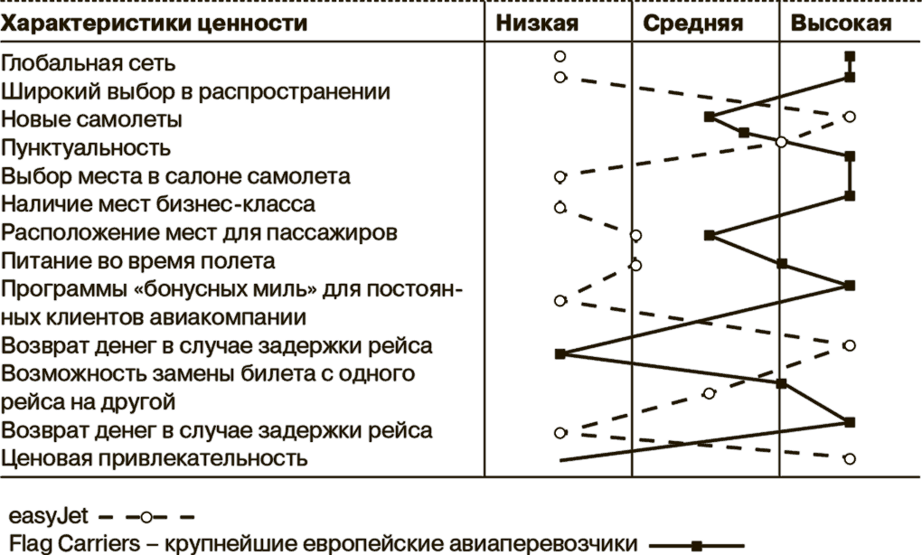 Для того чтобы проиллюстрировать концепцию стратегических сегментов и модель трех видов ценности, возьмем в качестве примера индустрию авиаперевозок. В Европе лидером по низким ценам является easyJet, компания, созданная по образцу американской Southern Airlines.EasyJet достигла огромных успехов после ноября 1995 года, когда предложила авиабилеты из Лондона в Глазго, в одну сторону, по цене 29 евро, сопроводив их слоганом: «Летай в Шотландию по цене джинсов». Под руководством яркой личности, основателя этой авиакомпании Стелиуса Хаджи-Иоанну (который предпочитает, чтобы к нему обращались просто по имени), easyJet стала на равных конкурировать с такими традиционно главными европейскими авиаперевозчиками, как British Airways, Air France, KLM и Swiss Airlines. Давайте сравним европейских континентальных авиаперевозчиков и easyJet в отношении трех видов ценности, чтобы увидеть значение стратегических сегментов.