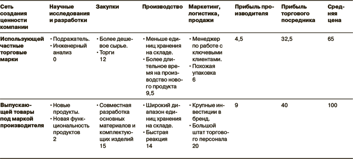 По сравнению с товарами под маркой производителя, розничная наценка для торговых марок была выше в процентном отношении (50 % и 40 %), но ниже в абсолютном денежном эквиваленте (32,5 доллара и 40 долларов). Как компания, создающая торговые марки (4,5/32,5), так и компания, выпускающая товары под маркой производителя (9/40), получали на продажах прибыль в размере около 15 %. При этом они достигли такого показателя путем оптимизации ценностной сети совершенно разными способами.