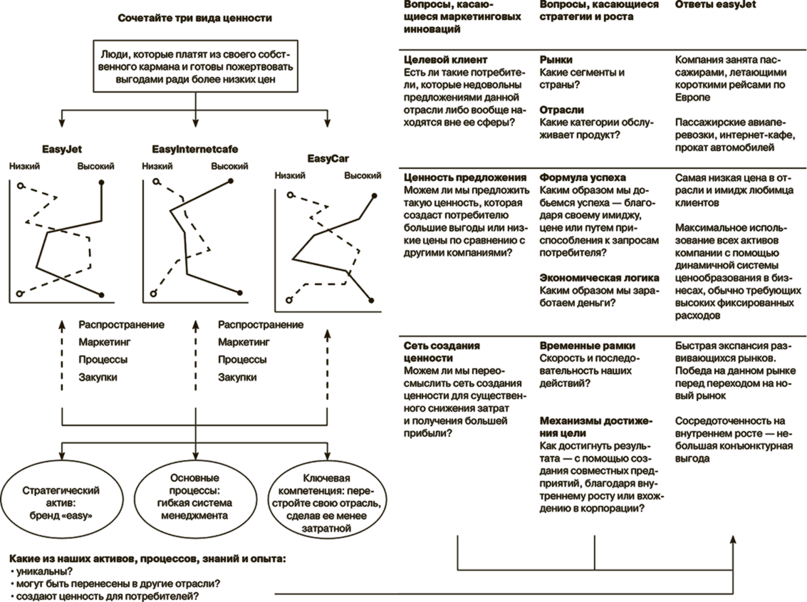 Четыре вопроса о ценности предложения и эти три вопроса помогают осмыслить возможности для маркетинговых инноваций в той или иной отрасли. А использование трех видов ценности для внедрения инноваций показывает, что они не являются только полем деятельности научно-технического и опытно-конструкторского отдела и сотрудников компании по разработке продукта. В создание инноваций могут также внести большой вклад маркетологи и стратеги, изучая факты плохого обслуживания или недовольства каких-то сегментов потребителей, предлагая новые кривые ценностей и переосмысляя ценностные сети данной отрасли.