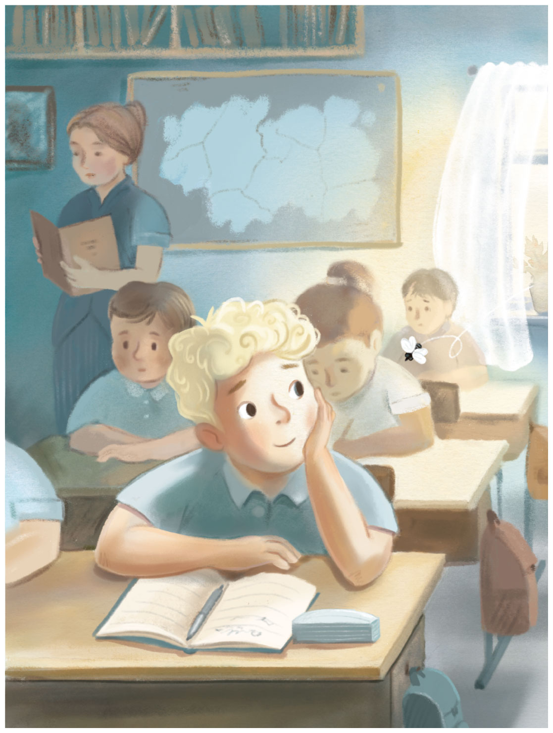 Ванька пристально следил за жирной мухой, летающей по классу. Муха пронеслась над Ваниной головой и, как заходящий на посадку самолёт, опустилась к полу. Она вывела между стеной и стулом замысловатые геометрические фигуры, взмыла под потолок, сделав большой круг почёта, и вернулась. Над Ваниным ухом вновь раздавалось жужжание.