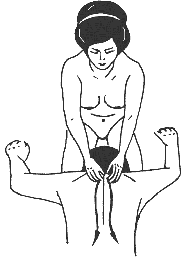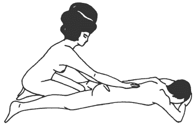 Зачастую в нижней части живота накапливается напряжение, не позволяющее нам в полной мере насладиться сексуальной игрой. Прием массажа, описанный здесь, помогает избавиться от угнетенной сексуальности. Растягивание тела в стороны в области нижней части живота, позволяет ощутить комфорт в области гениталий и расслабиться. Захватите мышцы по бокам от тазобедренных суставов и слегка оттяните в обе стороны. Задержитесь в этом положении, позволяя ощутить партнеру, как его покидает напряжение в этой области.