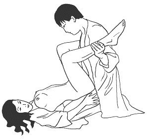 Мужчина становится на колени и опускает ягодицы на пятки. Женщина садится мужчине на колени и ложится на спину, затем закидывает ноги на плечи партнеру. После принятия нужного положения, мужчина вводит свой член в лоно женщины.