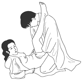 Женщина лежа на спине или опираясь на подушки, поднимает ноги, разводит их, держась руками за лодыжки. Сидя на коленях, мужчина наклоняясь к партнерше и обхватывая ее за плечи или талию, осторожно вводит член в ее лоно.