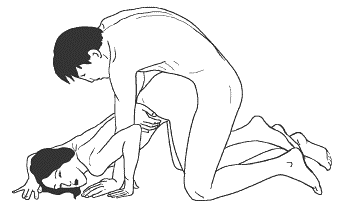 Женщина становится на колени лицом вниз, поджав под себя ноги и руки. Мужчина, встав на колени сзади партнерши и обнимая ее руками за талию, нежно или стремительно вводит член в ее лоно. Мужчина может не наклоняться к женщине, а сохраняя прямой спину и удерживая талию партнерши, насаживать или снимать ее со своего члена.