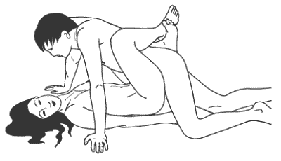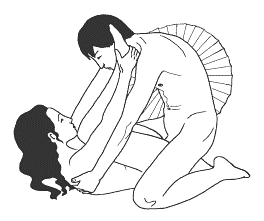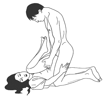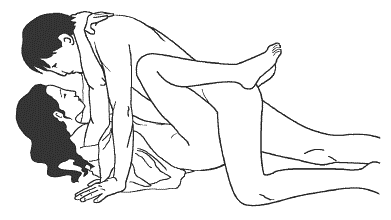 Женщина ложится на спину, обхватывая талию мужчины ногами, а спину руками. Мужчина становится на колени, наклоняется вперед и обнимает партнершу за спину. Затем осторожно вводит член в ее лоно.