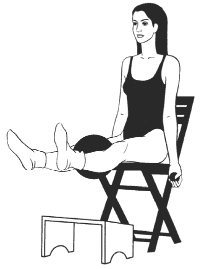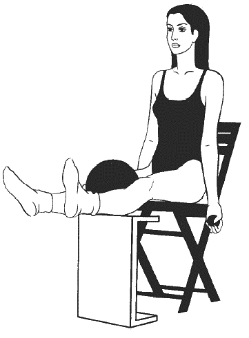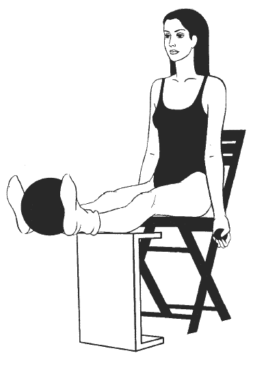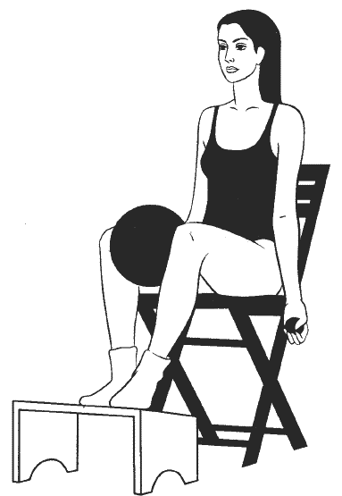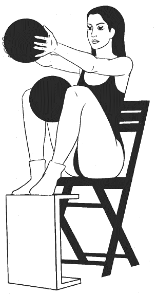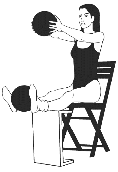 Сидя прямо, ноги согнуты в коленях и расположены на возвышении на уровне стула (см. рисунок), руки вытянуты перед собой, в ладонях большой мяч, второй большой мяч зажат между колен.