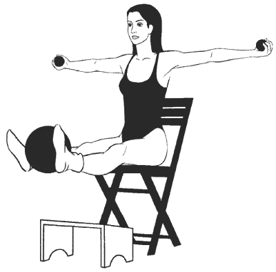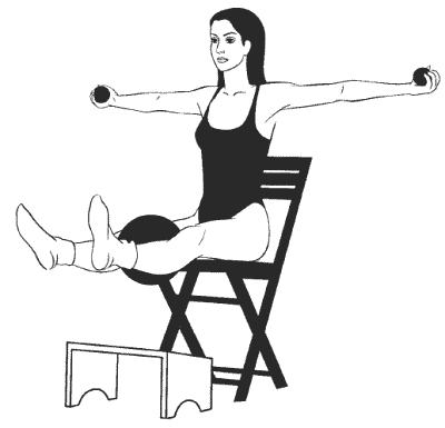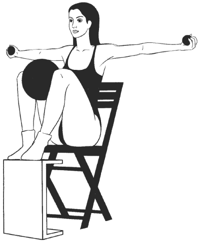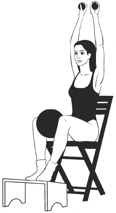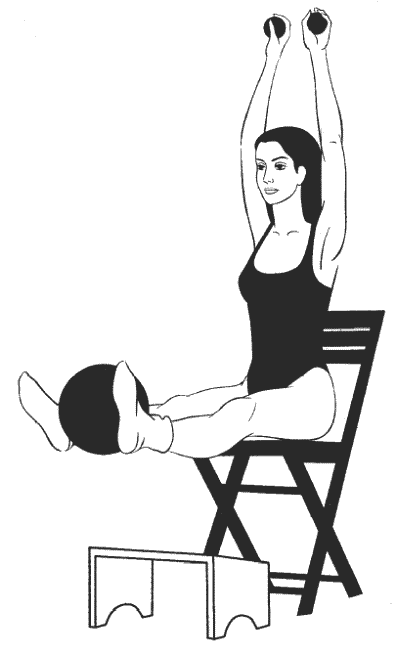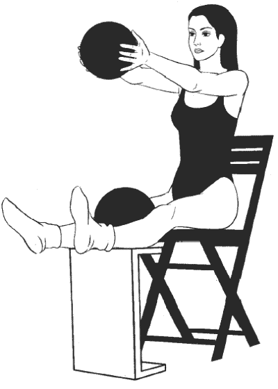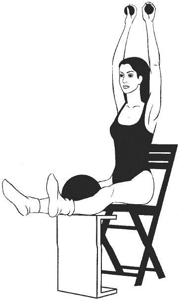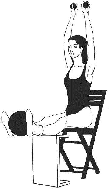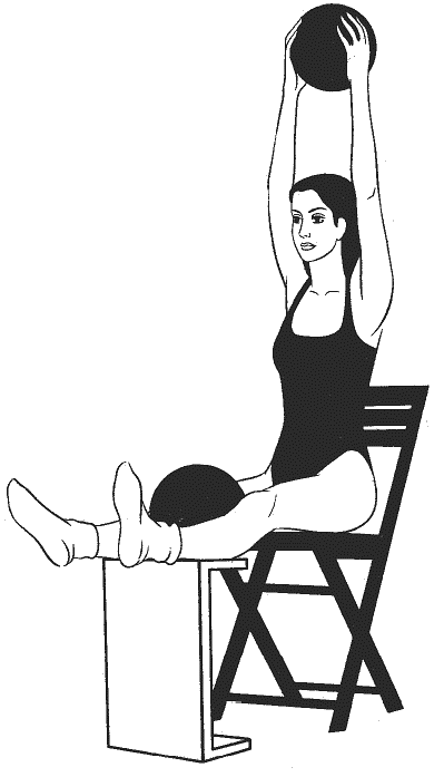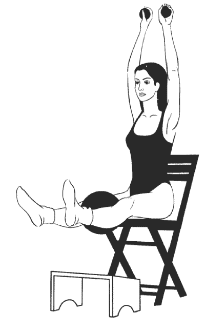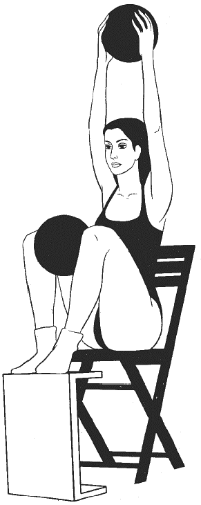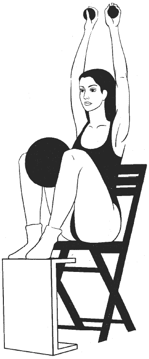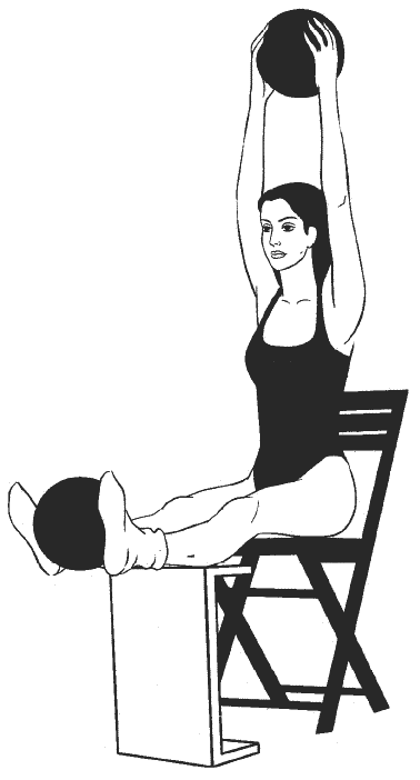 Сидя прямо, ноги согнуты в коленях и расположены на возвышении на уровне стула (см. рисунок), руки подняты над головой, в ладонях большой мяч, второй большой мяч зажат между колен.