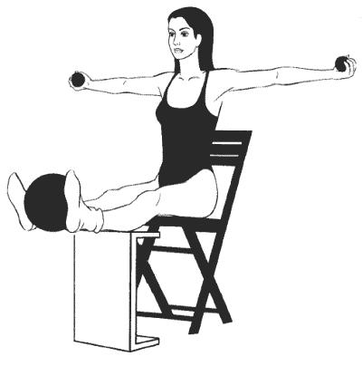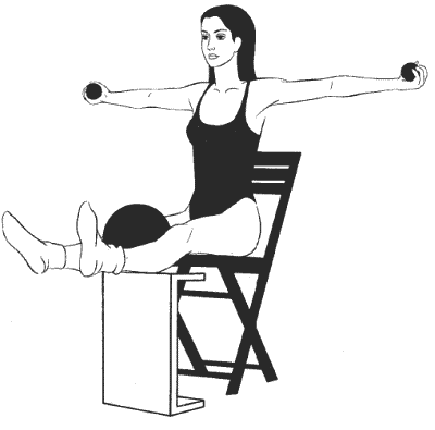 Сидя прямо, ноги согнуты в коленях и расположены на возвышении на том же уровне, что и стул, руки выпрямлены в стороны на уровне плеч, ладони направлены вверх и сжимают маленькие мячики, большой мяч зажат между колен.