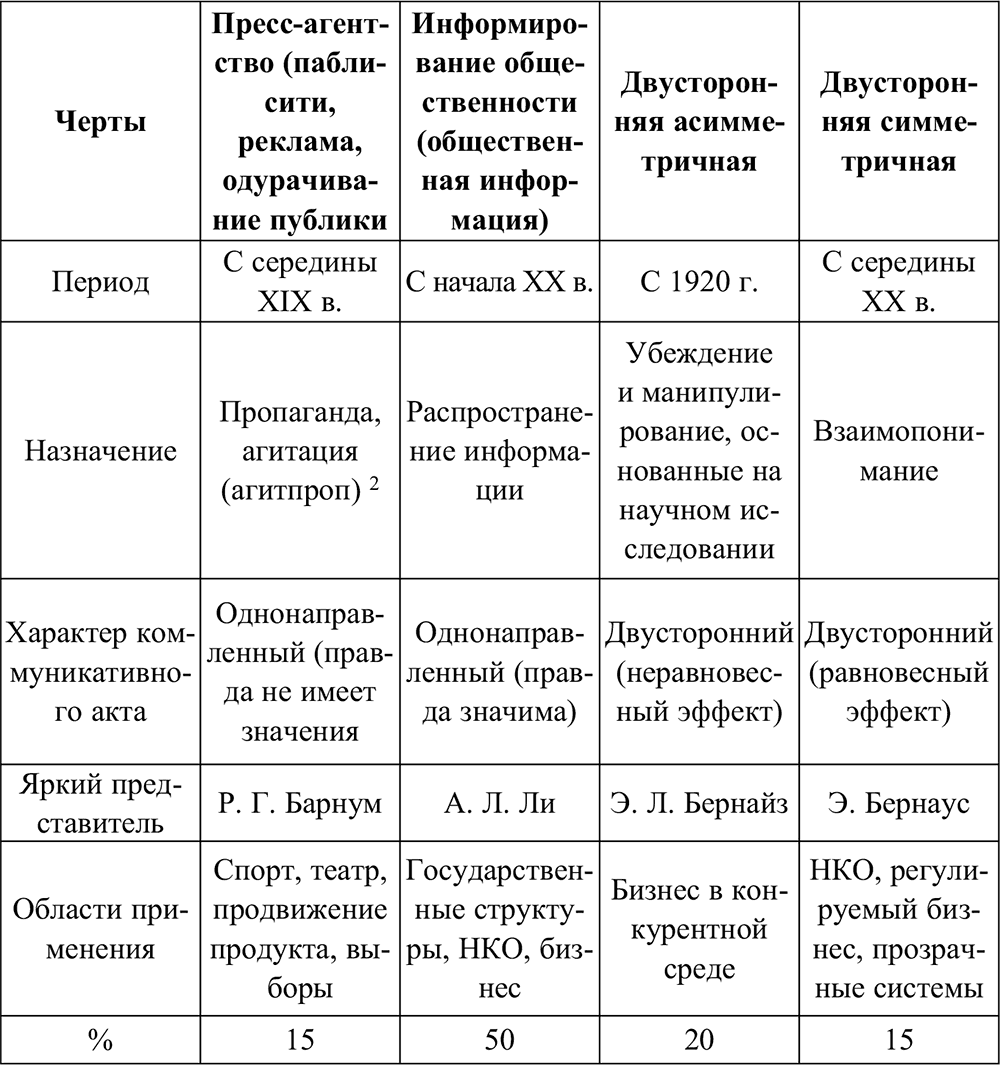 Развитие технологий и средств PR, их особенности тесно взаимосвязаны с развитием самого института связей с общественностью. Практически все исследователи института паблик рилейшнз выделяют четыре исторические модели PR[10]10