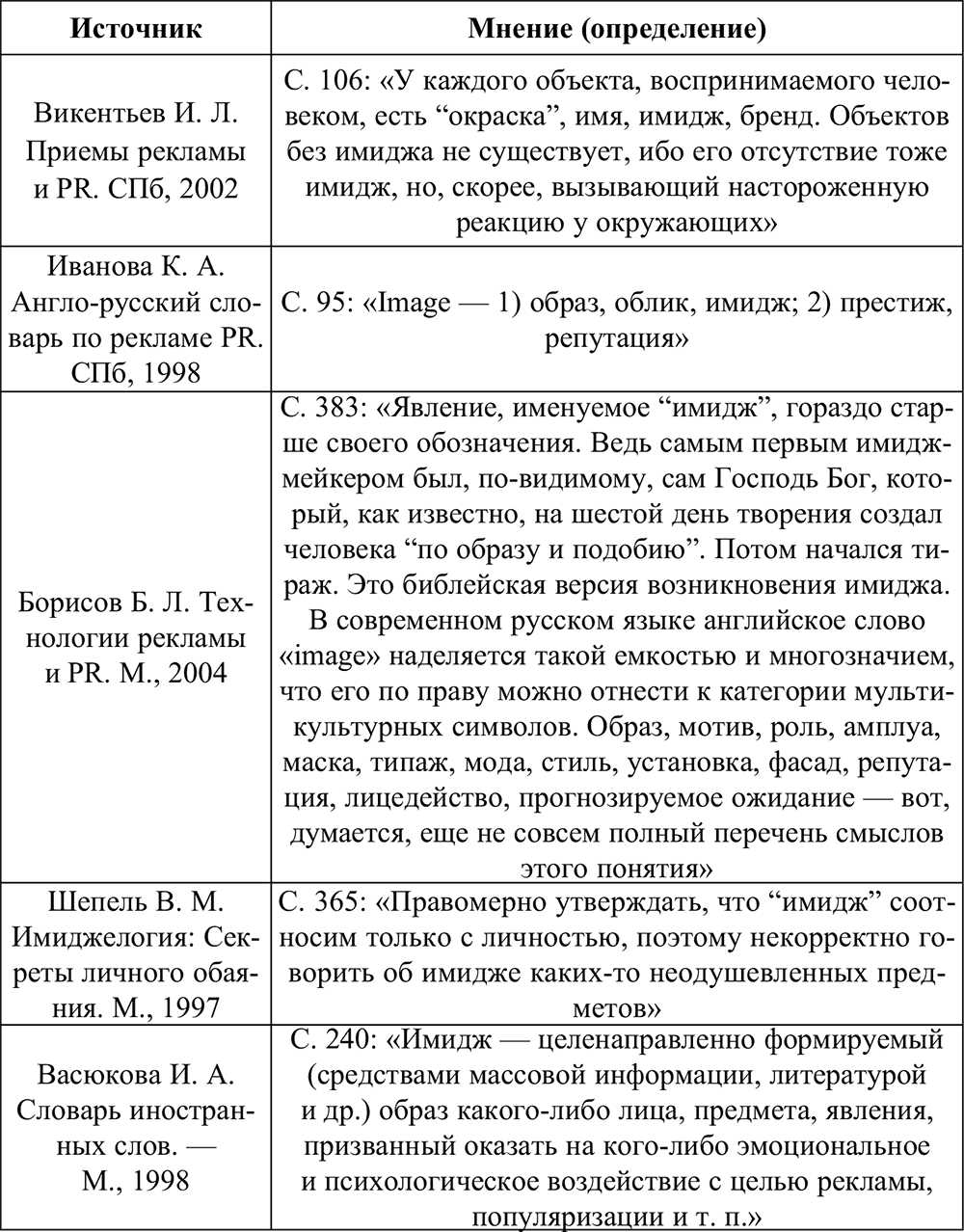 Модель пропаганды архаична, она четко отличается от трех последующих, абстрагируется от них. Три последующие модели на современном этапе развития взаимодополняют друг друга. Очень часто вторая и третья модели выдаются за четвертую. Последние три модели апеллируют к понятию «имидж». Определений понятия «имидж» множество. Все они чем-то отличаются друг от друга. В английском языке слово «image» имеет не одно, а, как минимум, пять значений: «образ», «статуя (идол)», «подобие (имитация)», «метафора», «икона»; при этом чаще в английской речи слово «image» употребляется в значении «образ» (табл. 2).