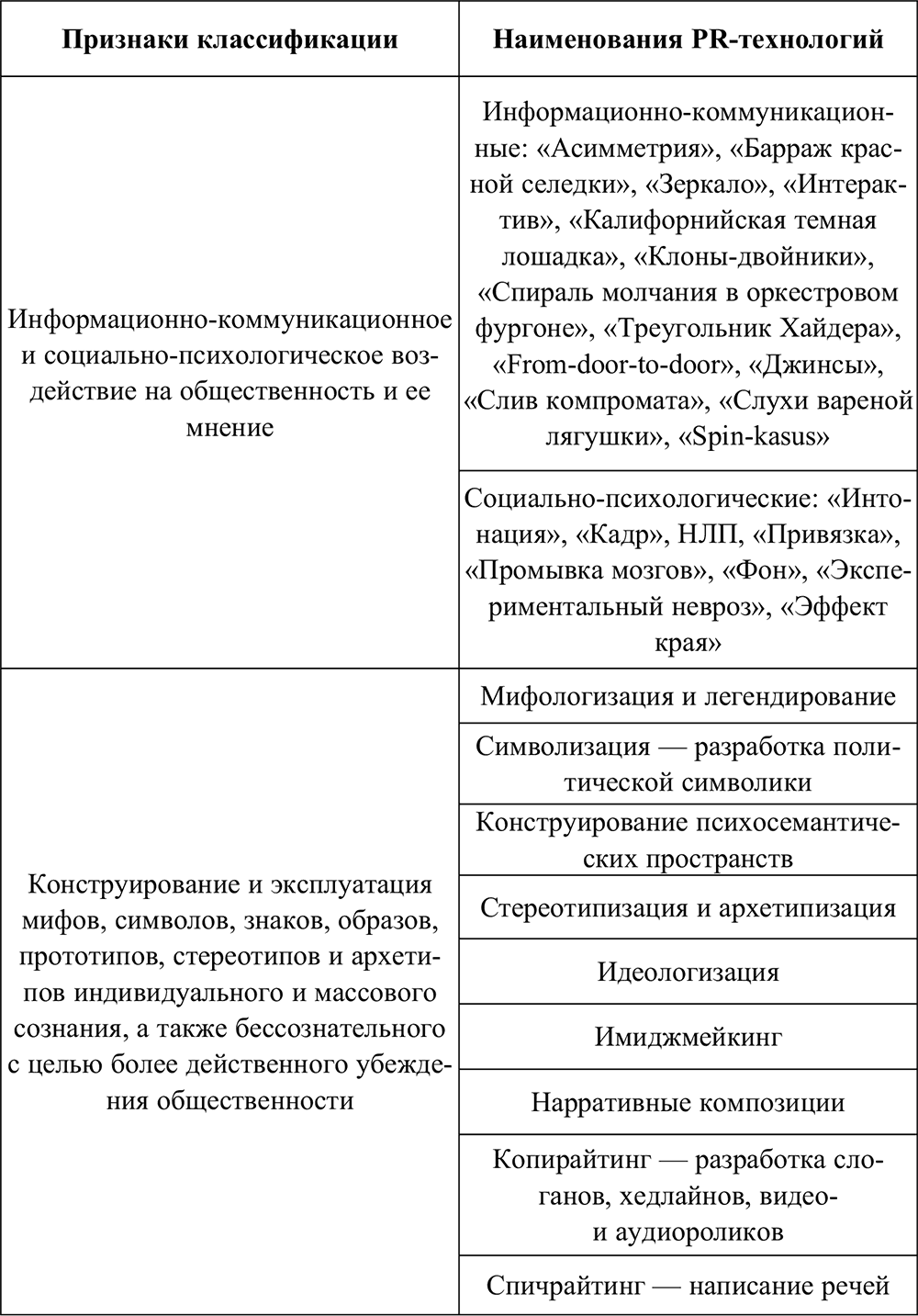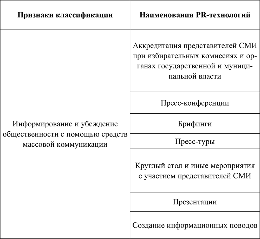 Часто используемая в практике классификация PR-технологий представлена в виде таблицы 3.