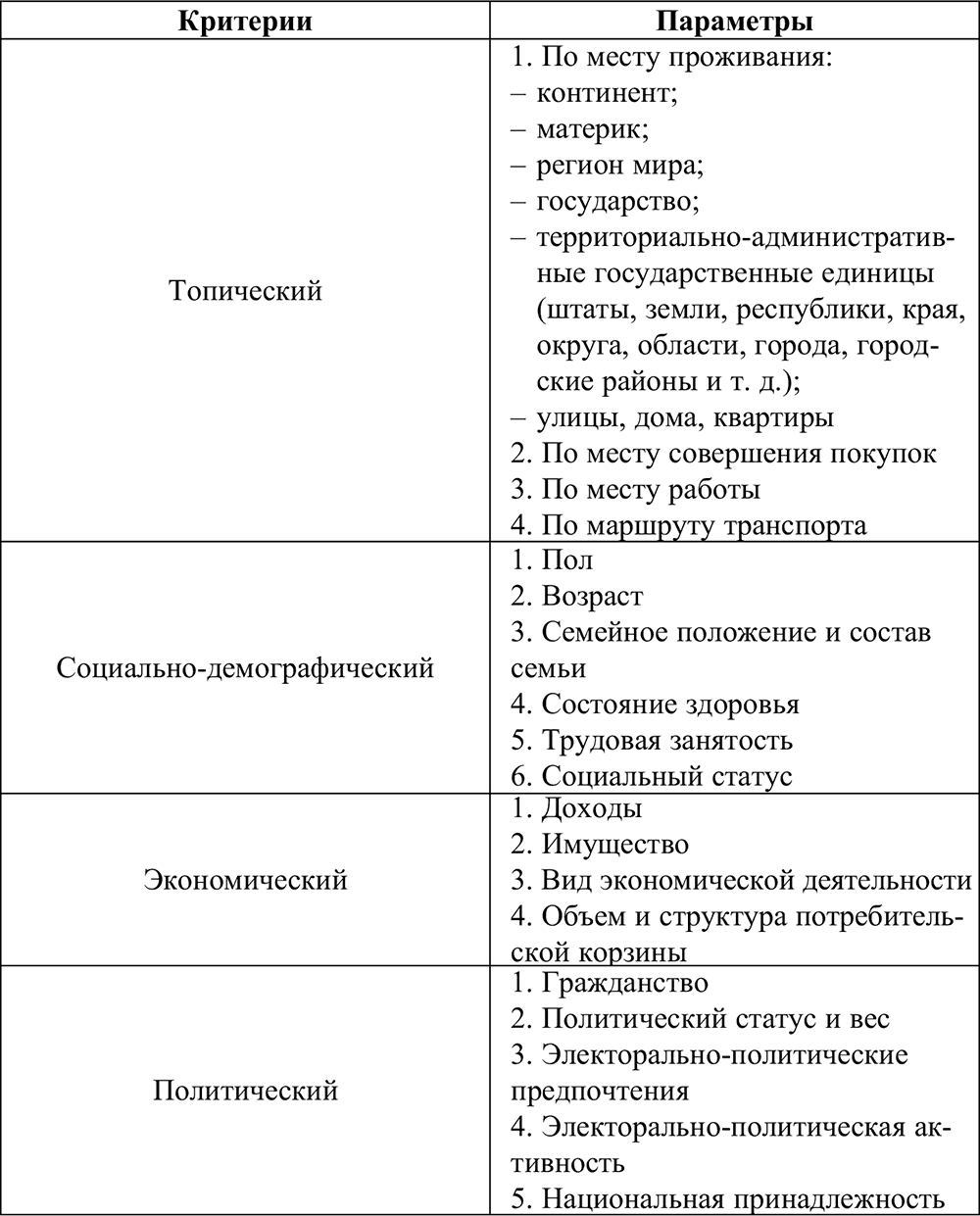 В основе сегментирования лежит конкретный критерий или признак. Безусловно, критерии сегментации зависят от специфики совокупности, однако существует базовый набор критериев сегментации: