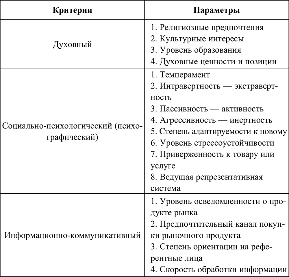 Этой таблицей критерии и параметры сегментации целевой аудитории не ограничиваются.